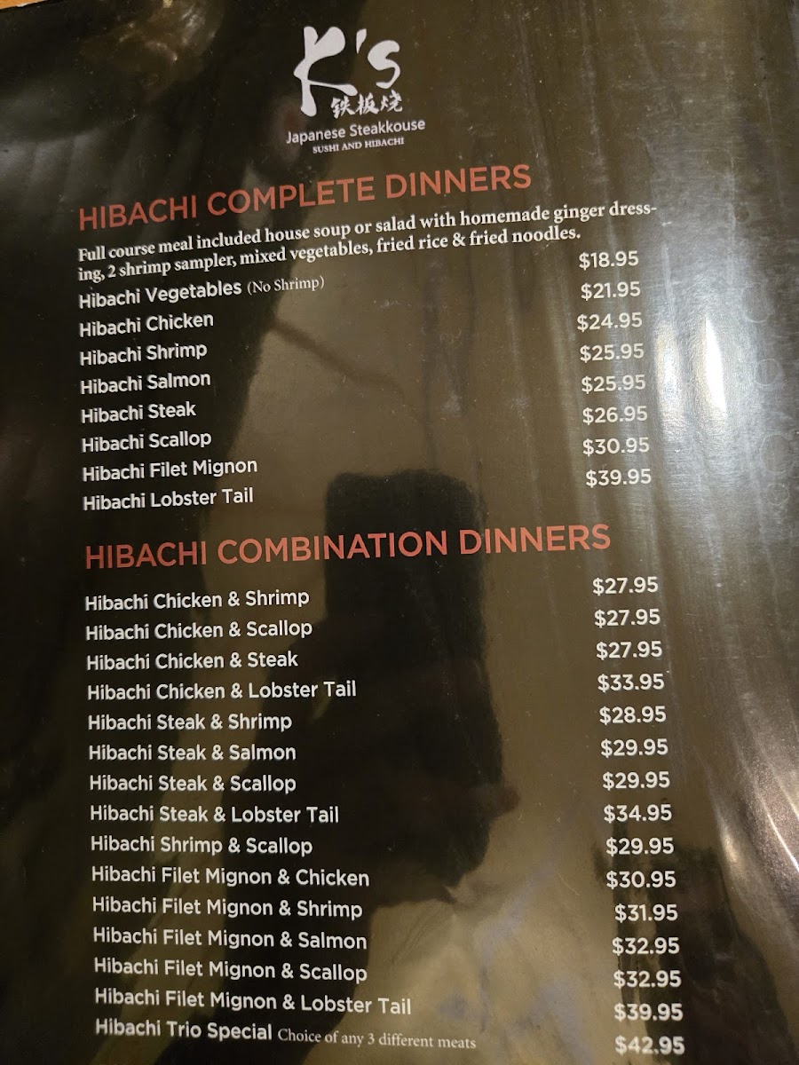 The menu at K's Restaurant features a variety of Japanese cuisine, structured to offer a broad selection suitable for lunch and dinner. It includes categories such as sushi and sashimi, hibachi complete dinners, tempura dishes, appetizers, and sauces available for takeout.