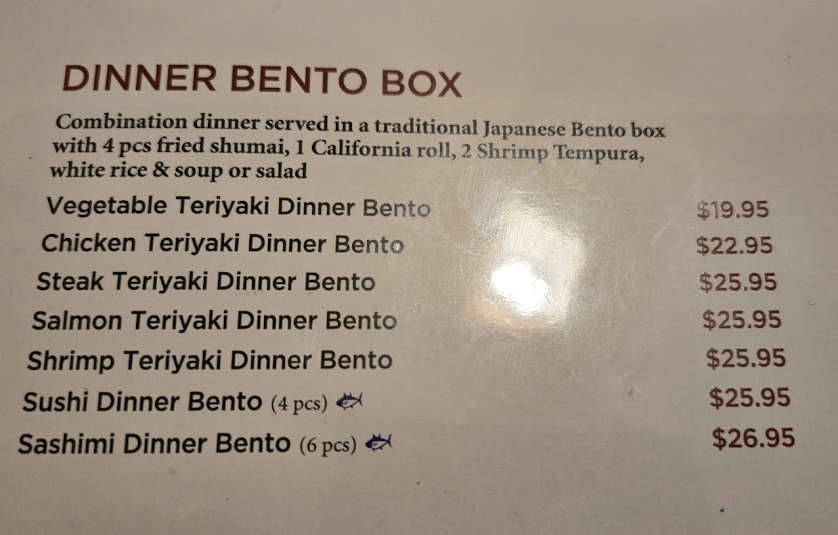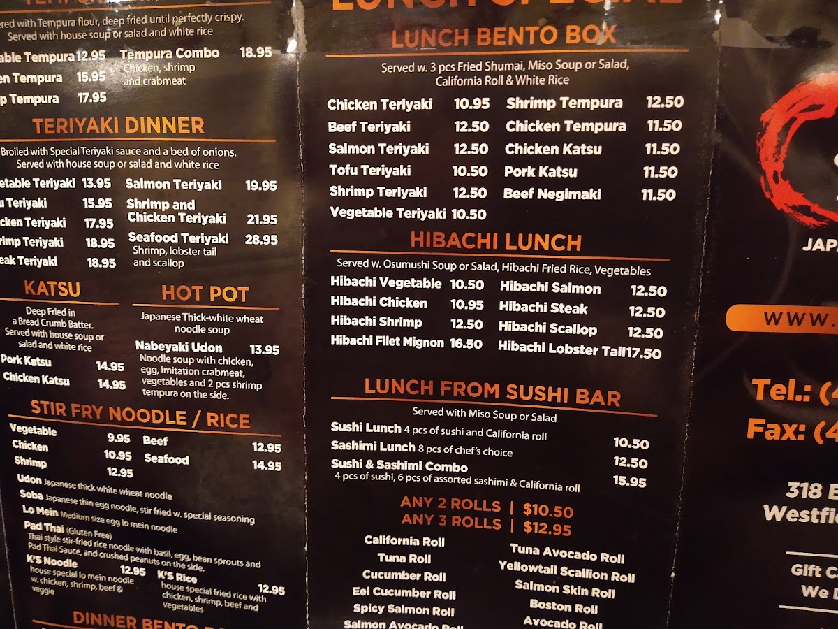 Overall, this menu accommodates casual dining and takeout, providing traditional Japanese dishes alongside hibachi-style meals suitable for group or individual dining experiences.