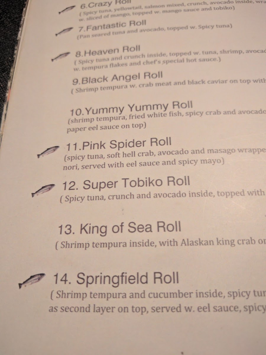 The sushi and sashimi options range from individual rolls like the Black Angel Roll, Kani and Spicy Salmon Roll, Rainbow Roll, and specialty combinations such as the Sushi and Sashimi Combination and Sushi Boat. There are also unique items like Urchin and Surf Clam Sashimi.